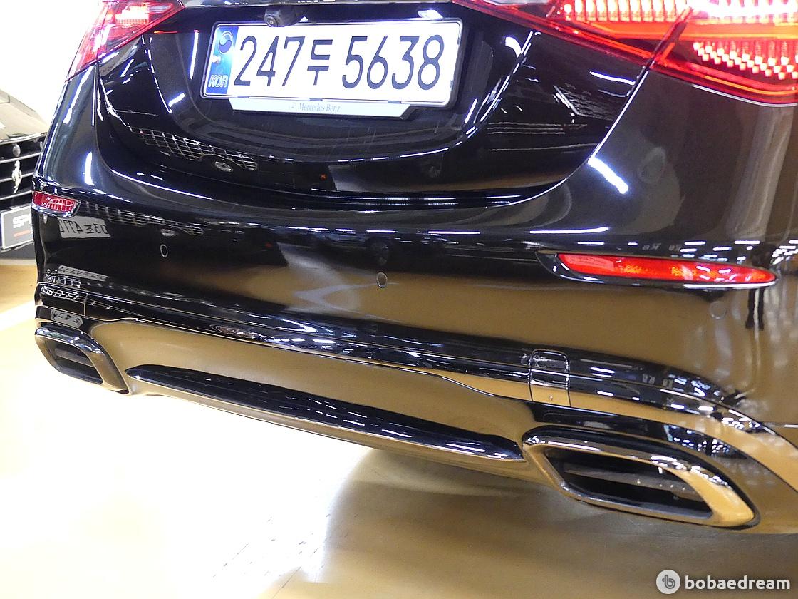 섹션으로 나눠진 진보적인 디자인의 테일 라이트와 마이바흐 전용 리어 범퍼 및 배기 파이프가 장착되어